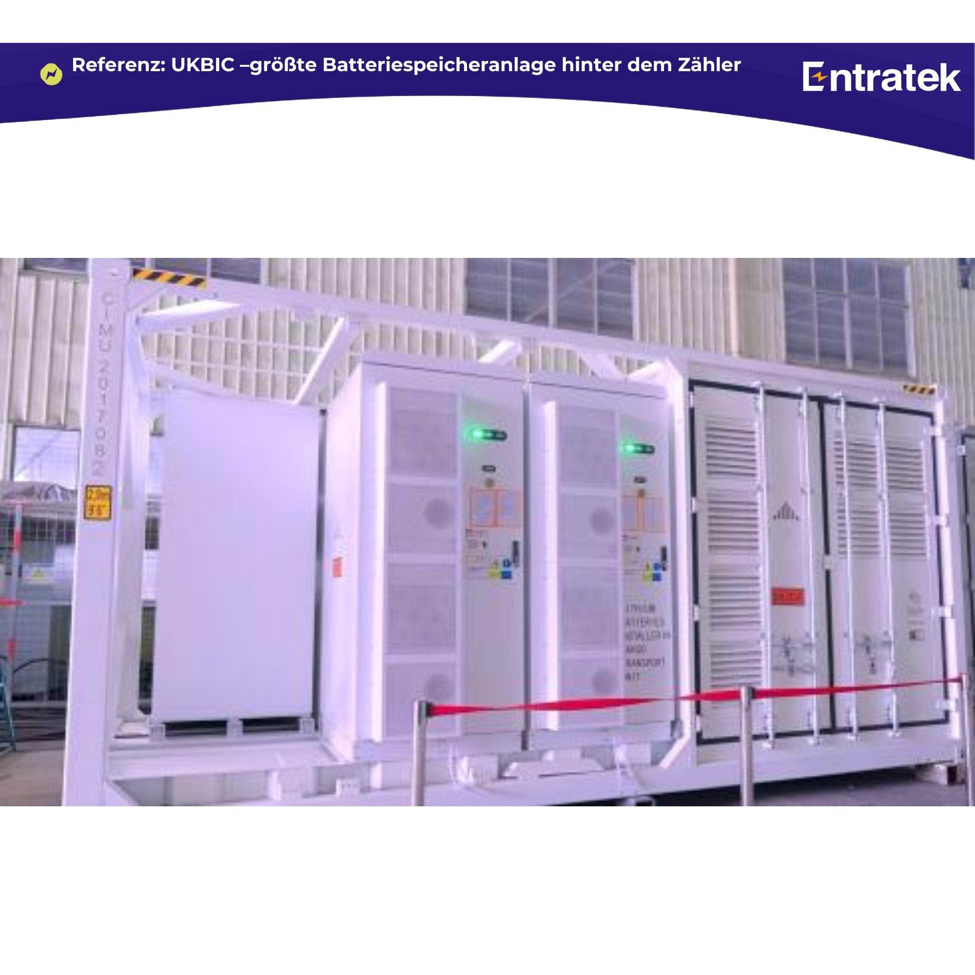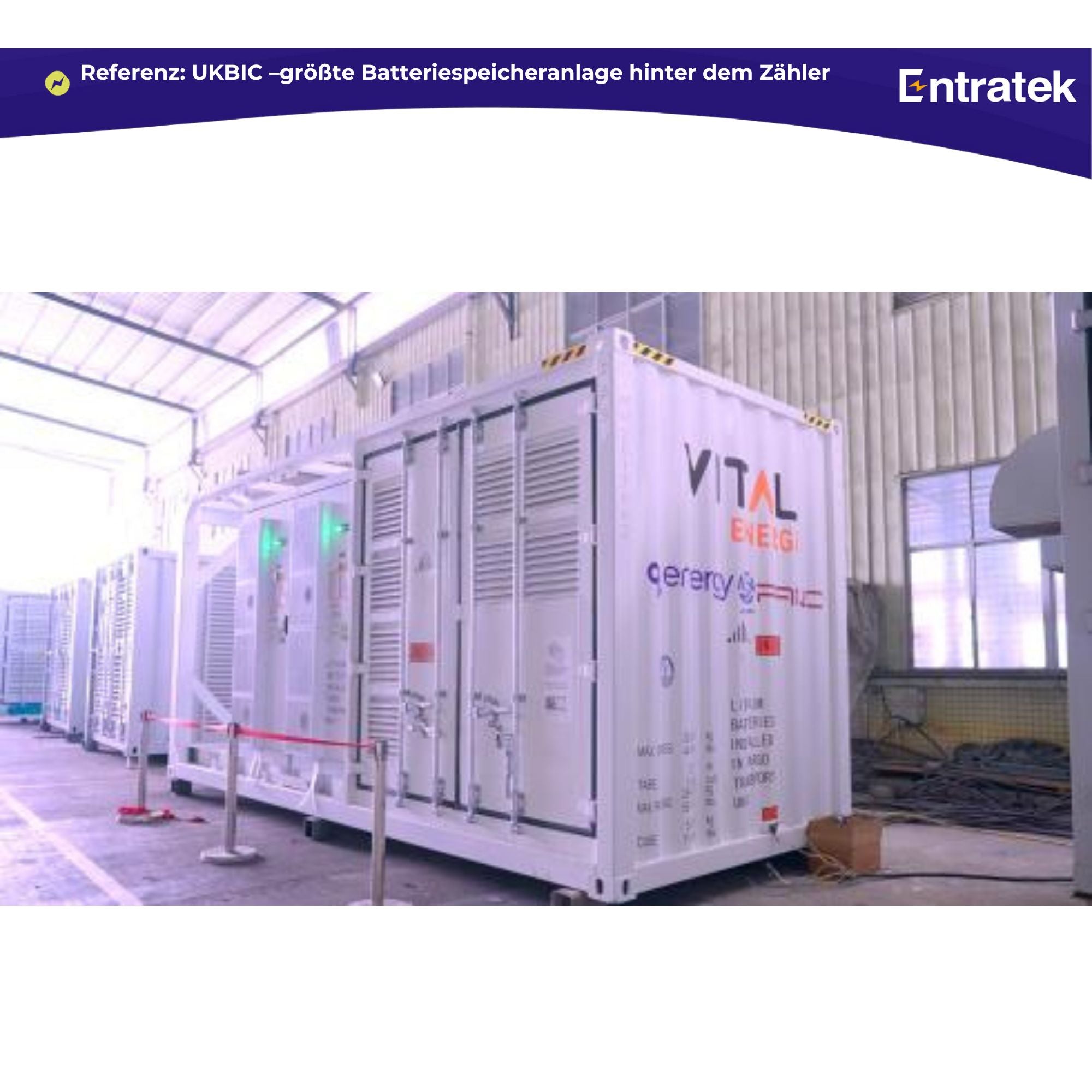 Die optimale Größe hängt von Ihrem Lastprofil, der PV-Leistung und den wirtschaftlichen Zielen ab. Entratek dimensioniert Batteriespeicher individuell – von 100 kWh Gewerbespeicher bis zu mehreren MWh Großspeicher. Ein prominentes Beispiel ist die größte netzgebundene Eigenverbrauchs-Batteriespeicheranlage (Largest Behind-the-Meter Battery Storage) in Großbritannien, die optimal an die dortige PV-Anlage angepasst wurde.